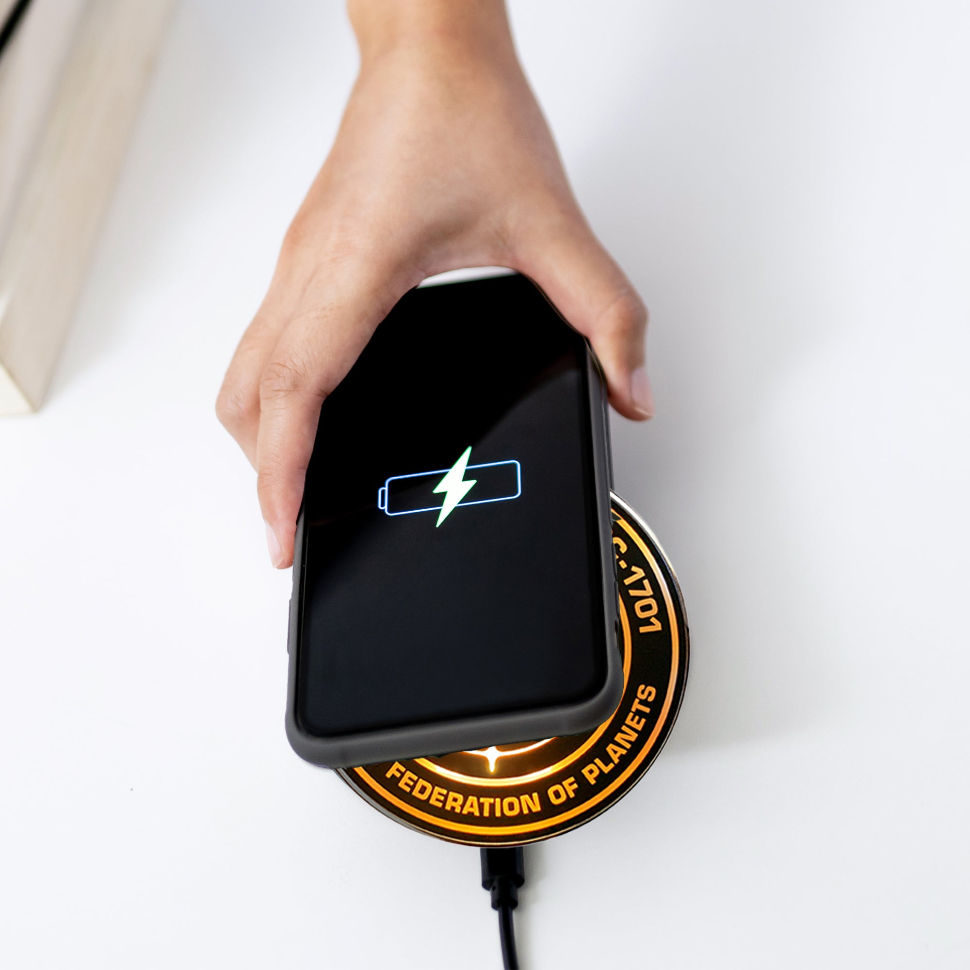You always need more power! Stay charged with your own Star Trek Strange New Worlds Qi Wireless charging pad with Built-In Battery & Illuminated Logo!