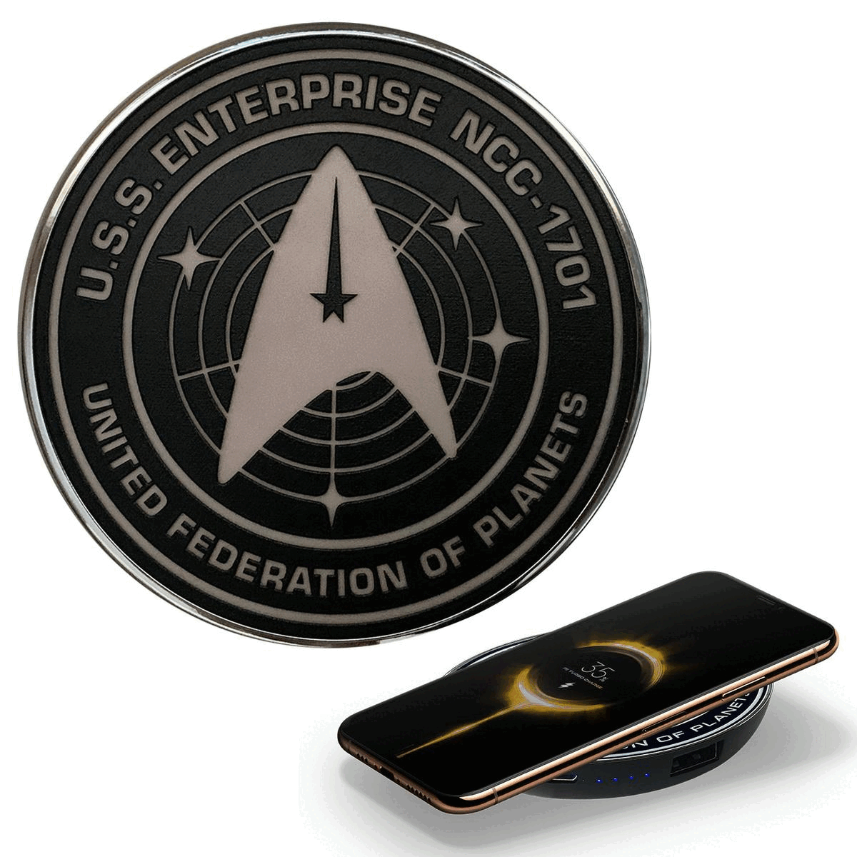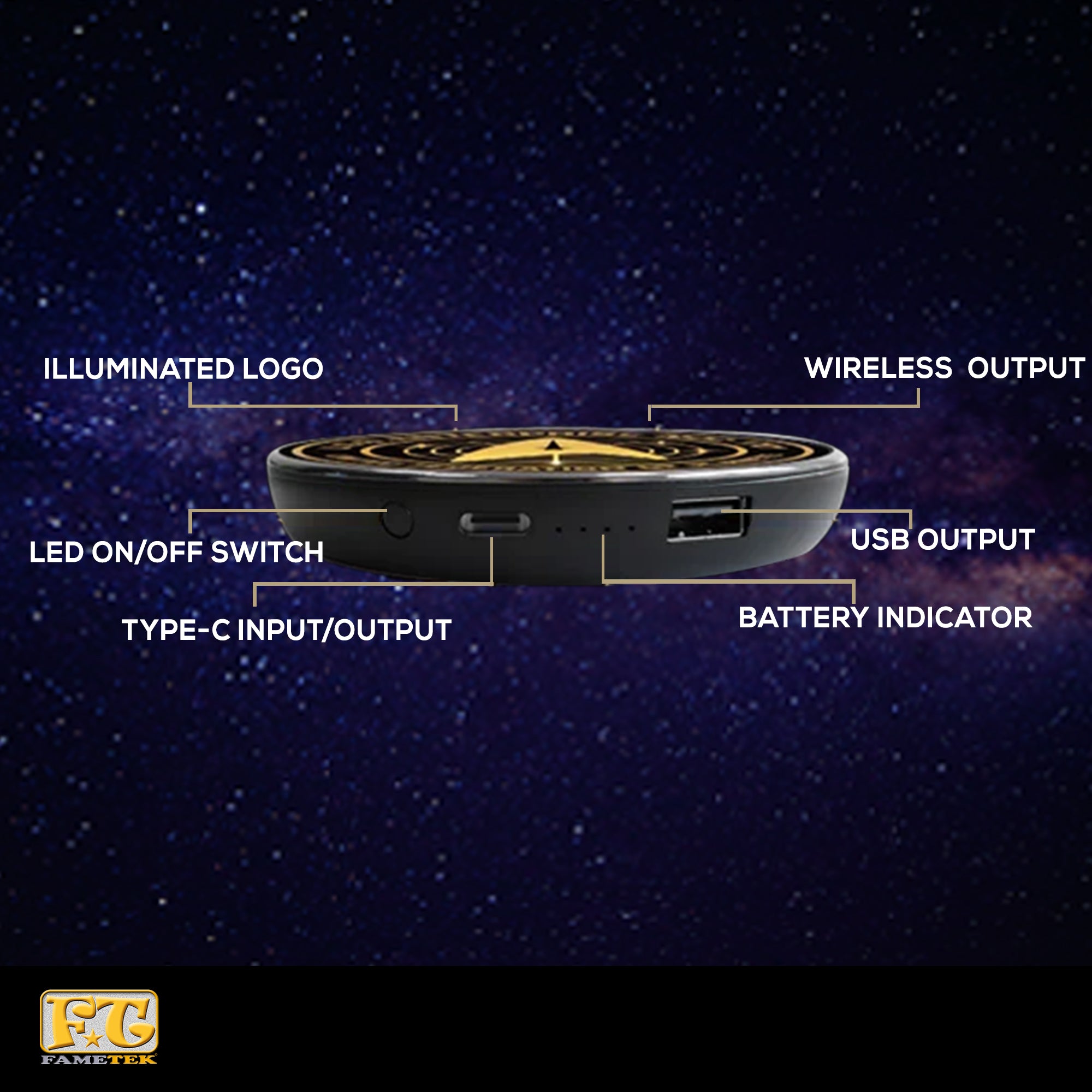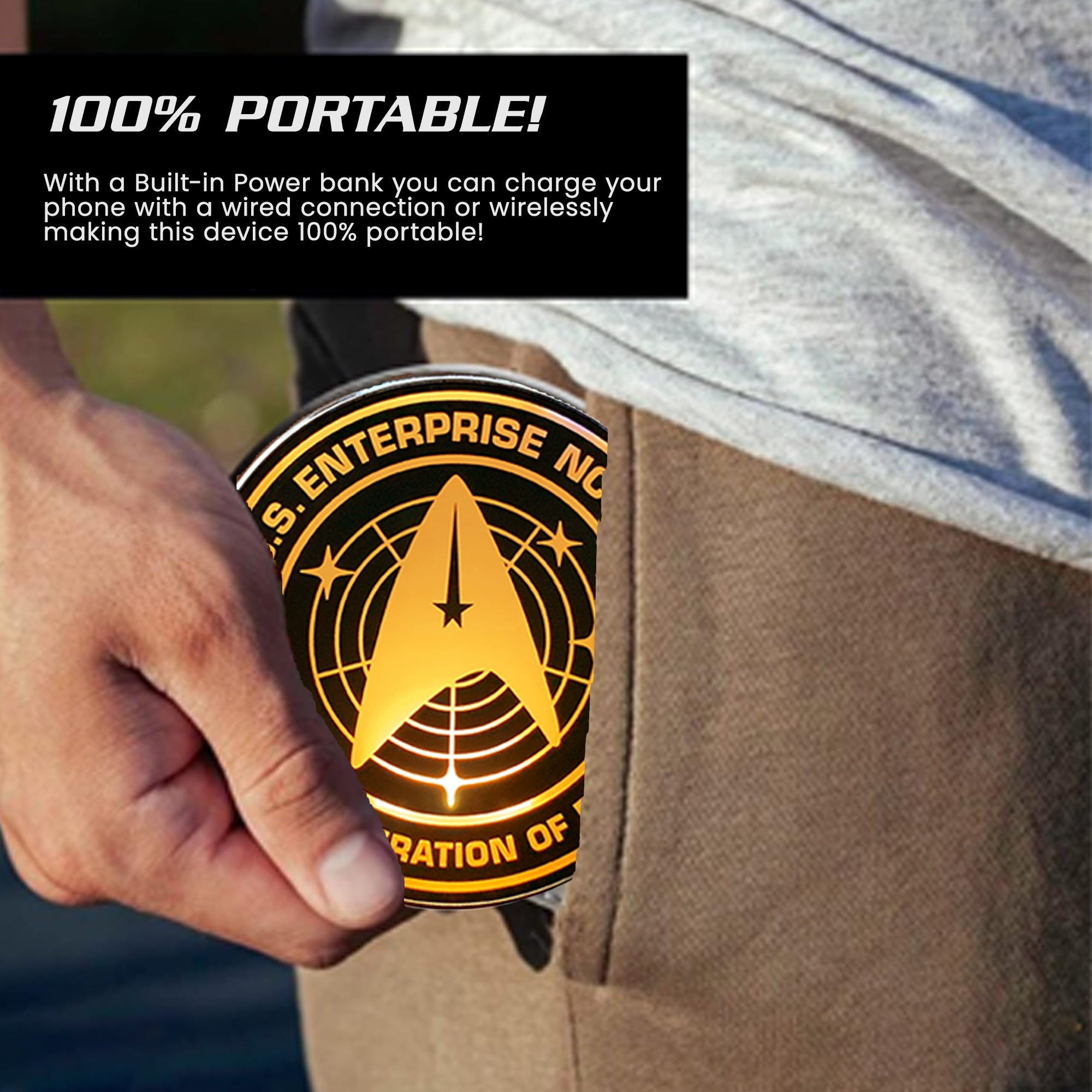 Star Trek Strange New Worlds Qi Wireless Charger With Illuminated Orange ENTERPRISE Emblem & Built-In Power Bank