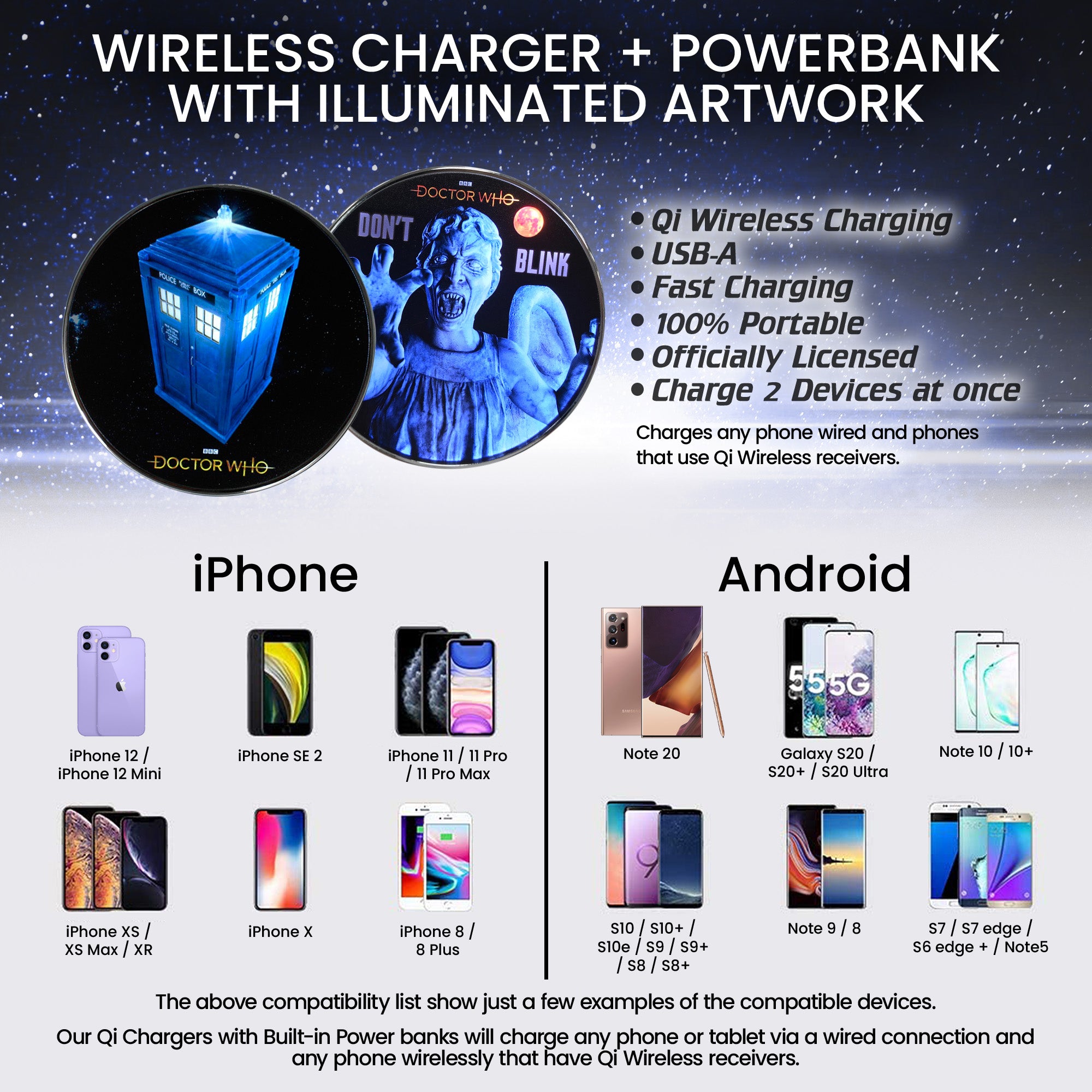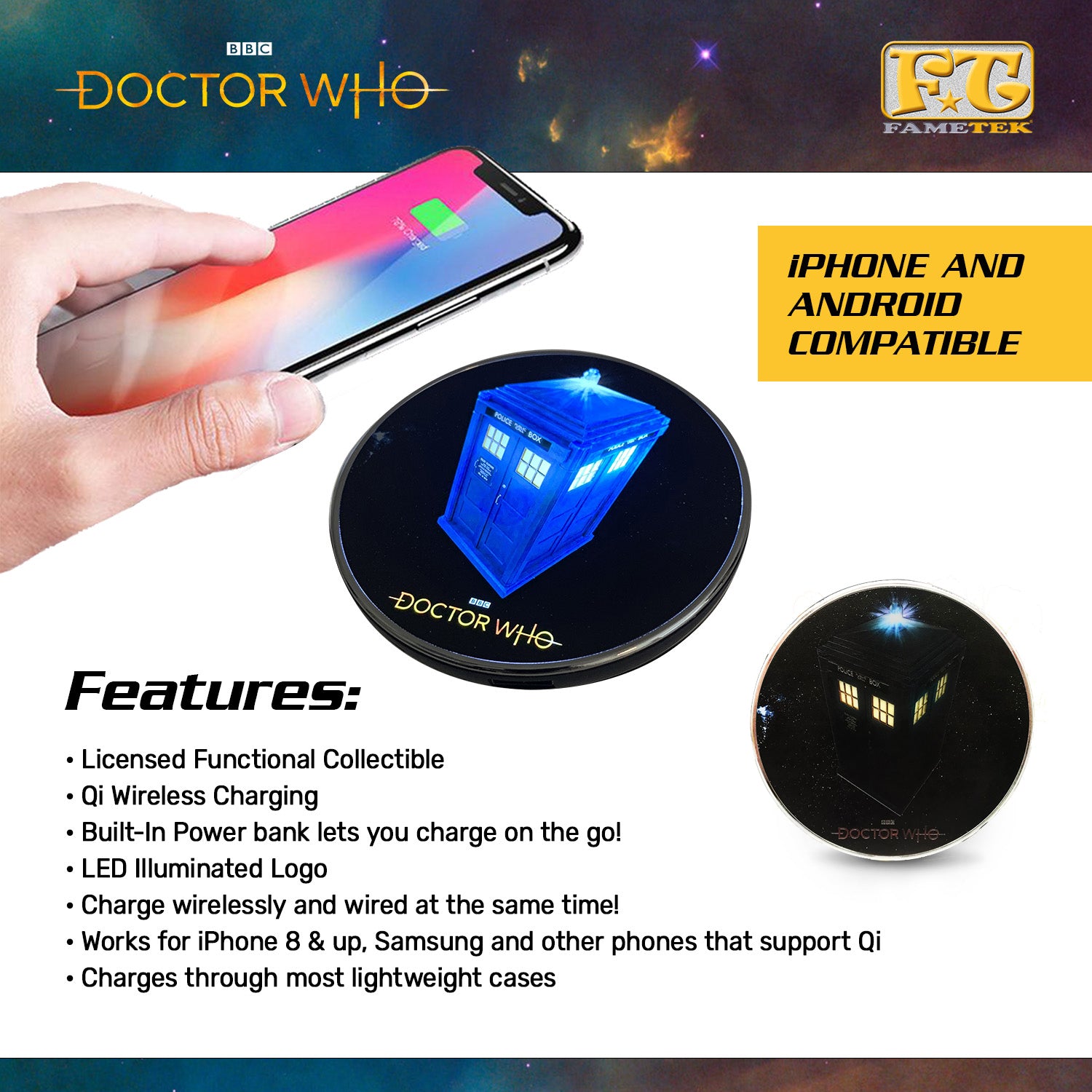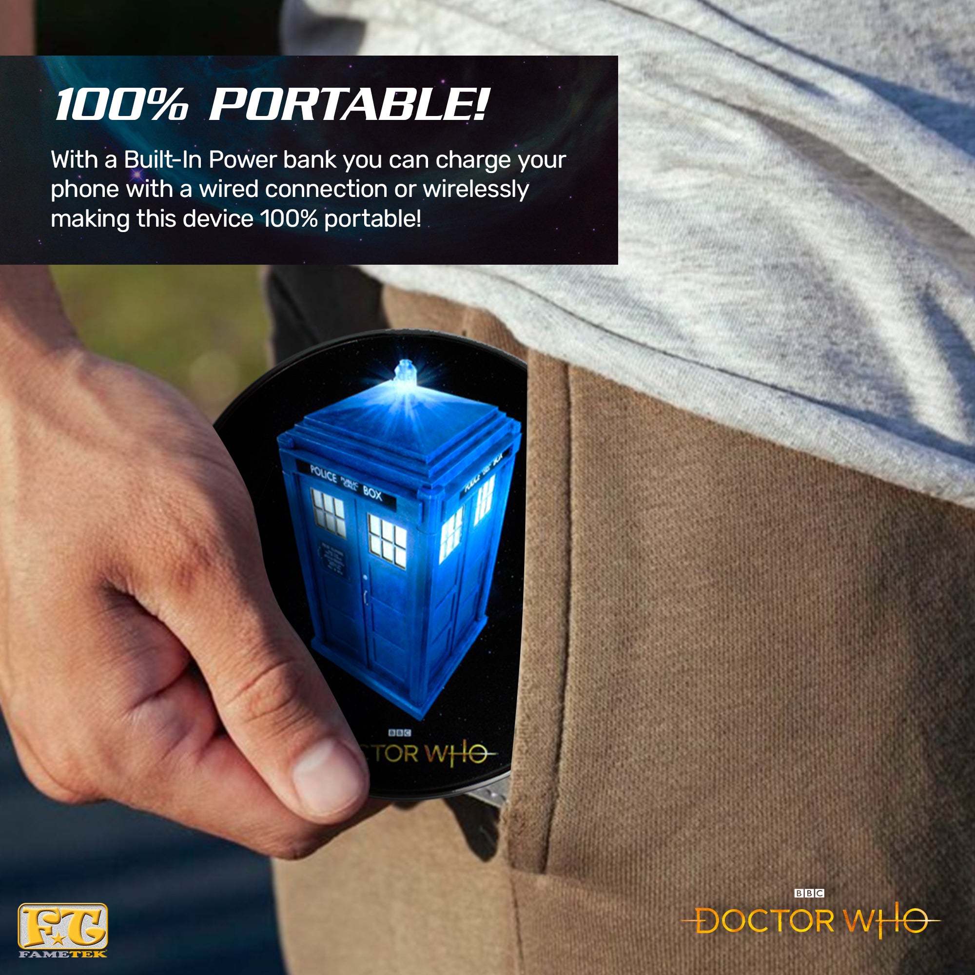 Allons-Y and forget about needing Artron Energy. This Doctor Who Qi Wireless charging pad with backup battery & Illuminated TARDIS does the charging for you.