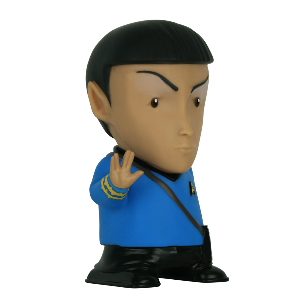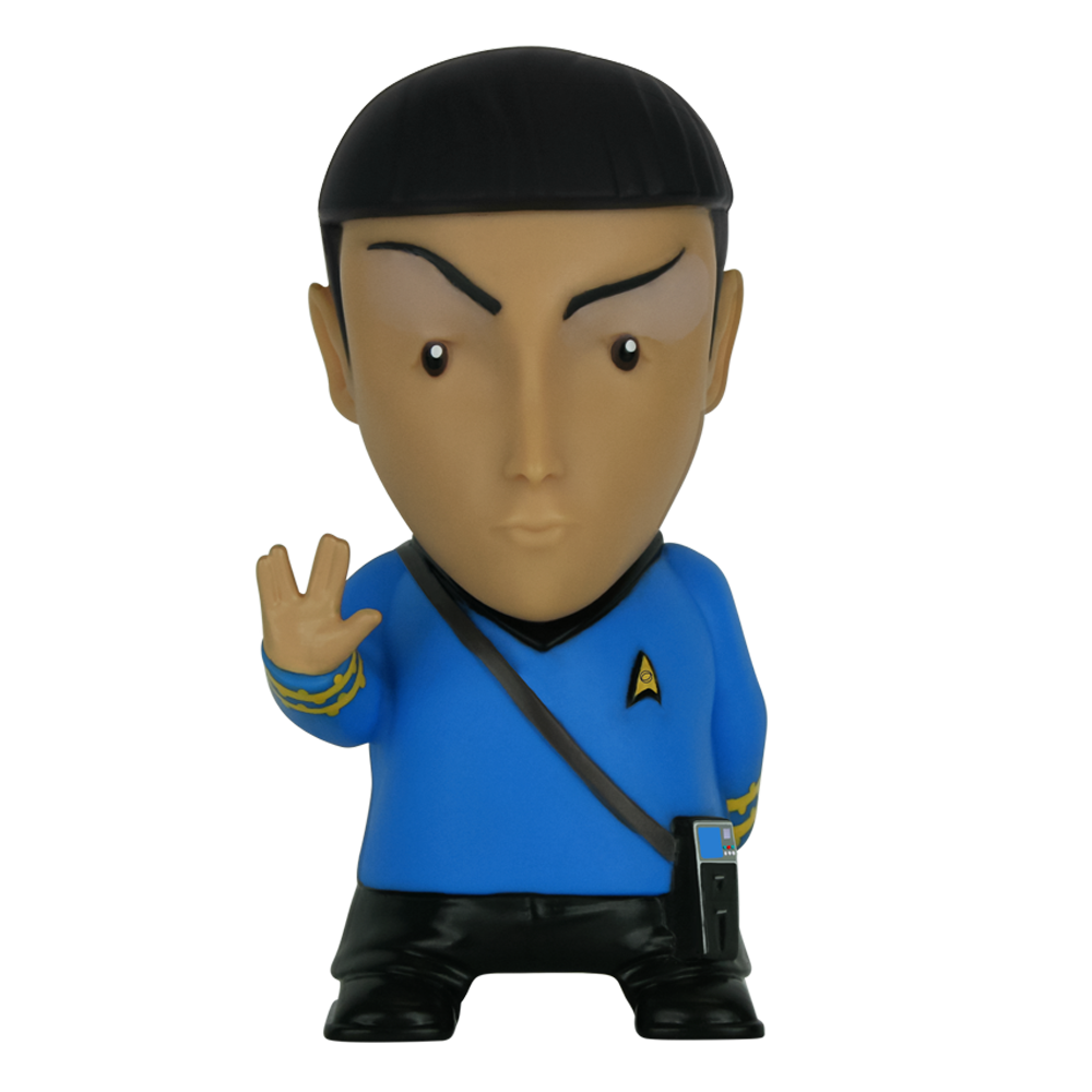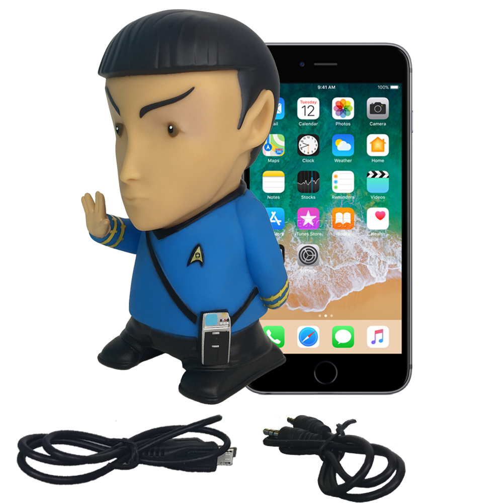 Celebrate the groundbreaking show Star Trek with your very own 6 Inch Mr. Spock Bluetooth® Speaker with sound effects. Mr. Spock salutes you with the famous Vulcan saying: "Live Long and Prosper" while the iconic Original Series Tricorder is attached to his belt. Use the try-me button to listen to 9 different handpicked sound clips from the TV show any time the unit is off. Additionally, 4 sound effects indicate different functions when the unit is on. Included with Mr. Spock is a USB charging cable and a 3.5mm cable for connected audio. Our Vulcan hero includes a high powered Full Range 1.5" speaker housed in an equalized chamber along with a microphone to take and make phone calls and has a 5-hour battery life for music playback.