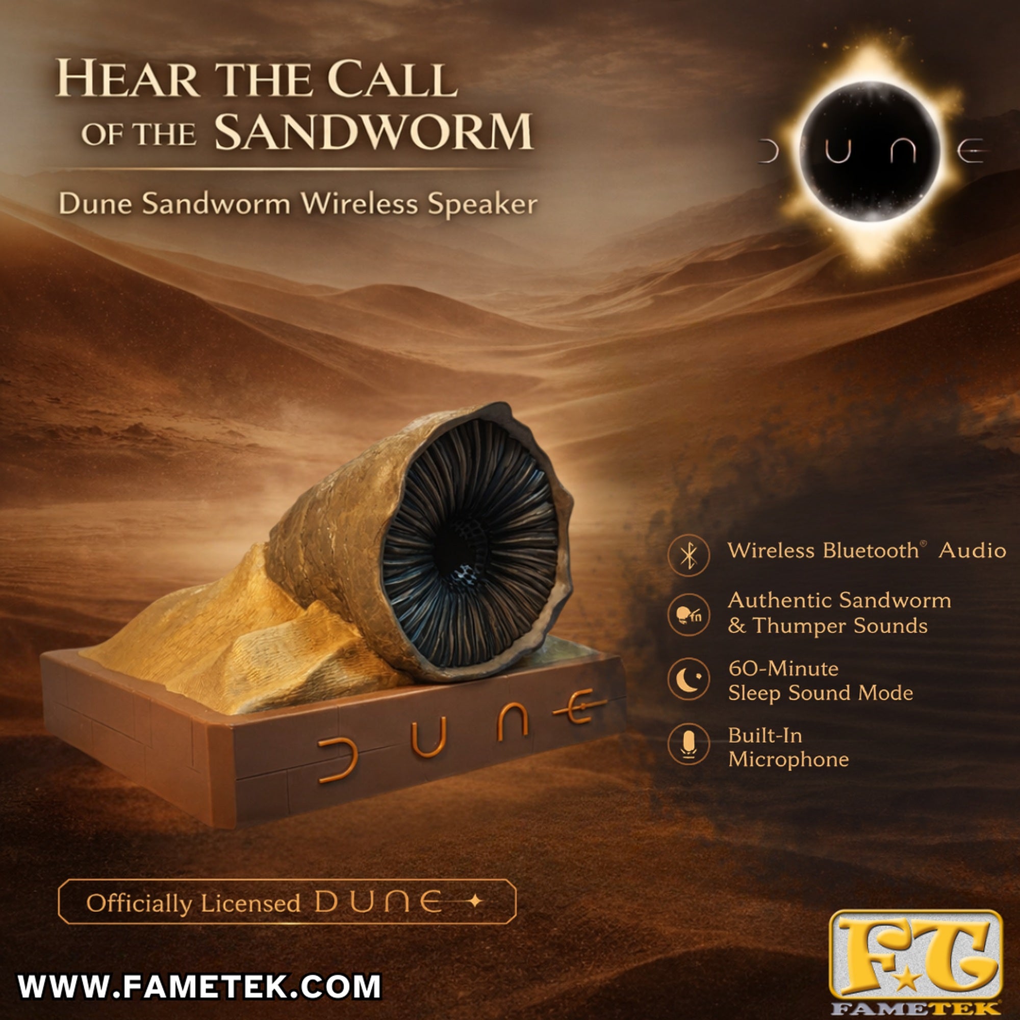 The DUNE Shai-Hulud Sandworm Wireless Speaker, a stunning fusion of cinematic artistry and cutting-edge audio technology. Officially licensed and beautifully crafted, this collectible speaker captures the majesty of the mighty sandworm atop a textured limestone base, making it perfect for fans, audiophiles, and collectors alike.