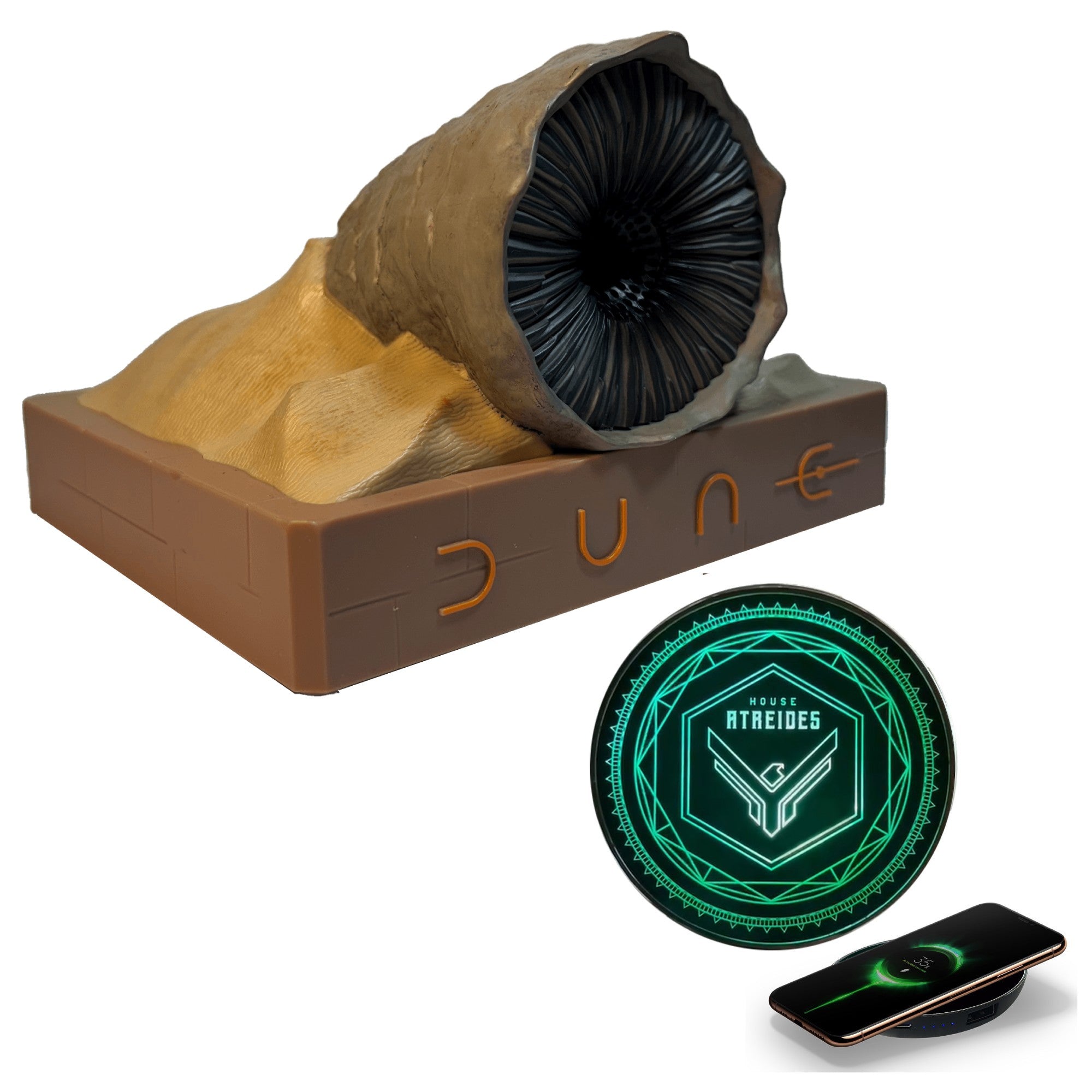 The DUNE Shai-Hulud Sandworm Wireless Speaker, a stunning fusion of cinematic artistry and cutting-edge audio technology. Officially licensed and beautifully crafted, this collectible speaker captures the majesty of the mighty sandworm atop a textured limestone base, making it perfect for fans, audiophiles, and collectors alike.