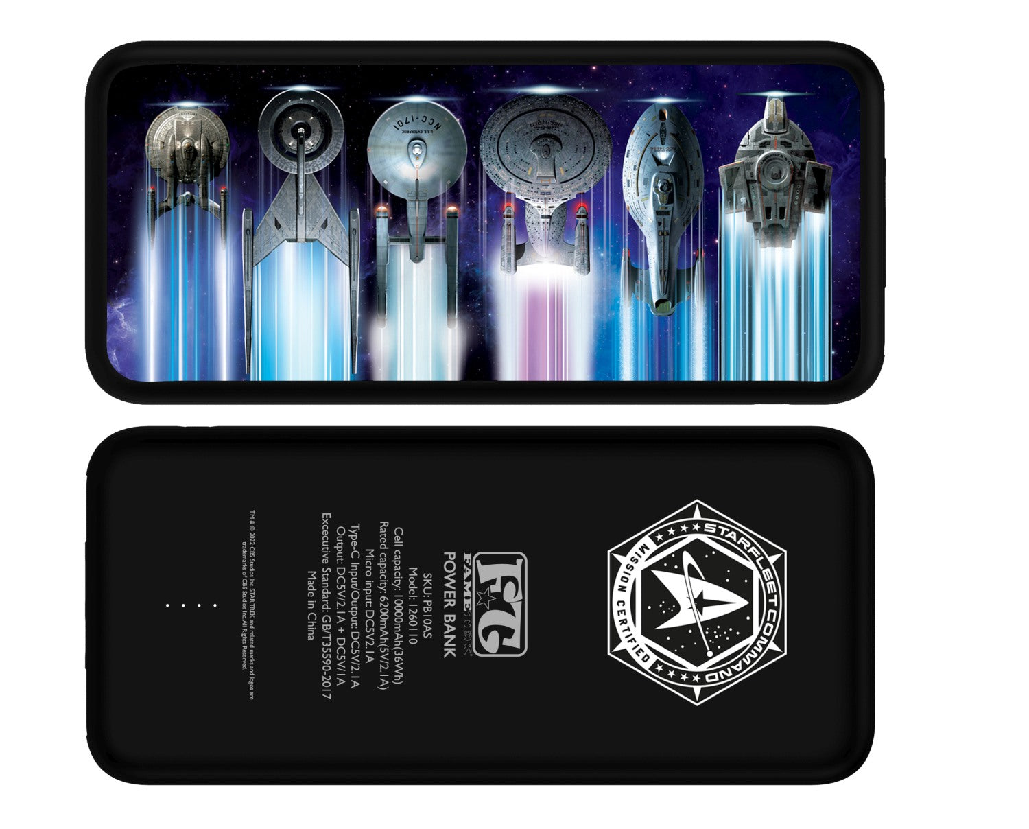 Ships included on the front of the power bank are the U.S.S. Enterprise NX-01, U.S.S. Discovery, U.S.S. Enterprise 1701, U.S.S. Enterprise 1701-D, U.S.S. Voyager, and the U.S.S. Defiant.
