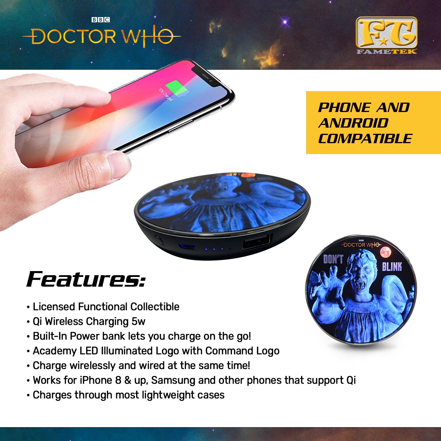 Unclutter your space and simplify charging with the Doctor Who Wireless Charging Pad. FameTek’s design for an efficient and high-speed charging at 2A for wired connections or standard 5W for wireless that work for various tablets and phones like most Androids and iPhone’s 8 and up!